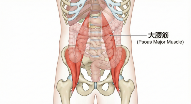 これは背骨から骨盤の内側を通り、太ももの付け根まで繋がっている唯一の「上半身と下半身を繋ぐ筋肉」です。